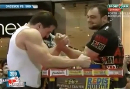 Meanwhile at an Italian shopping mall, a professional body builder challenges a professional arm wrestler to a match. One has giant muscles, the other strength and technique. Who will win? %%video1%%