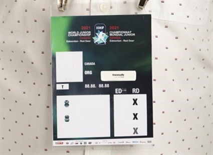 What looks like a thin pack of gum is attached to Braden Schneider's event credential…
