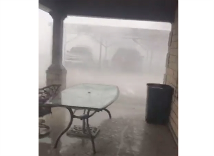 Debris from an incredibly intense south Texas storm blows by as this family shelters on the…