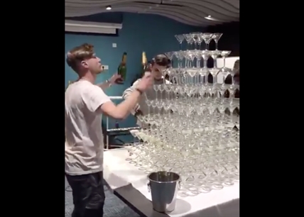 While a string quartet plays, this poor bartender accidently sends an entire tower of champagne…