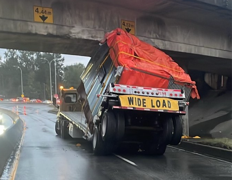 VANCOUVER – A transport truck hauling a large, square container slammed into an overpass in…