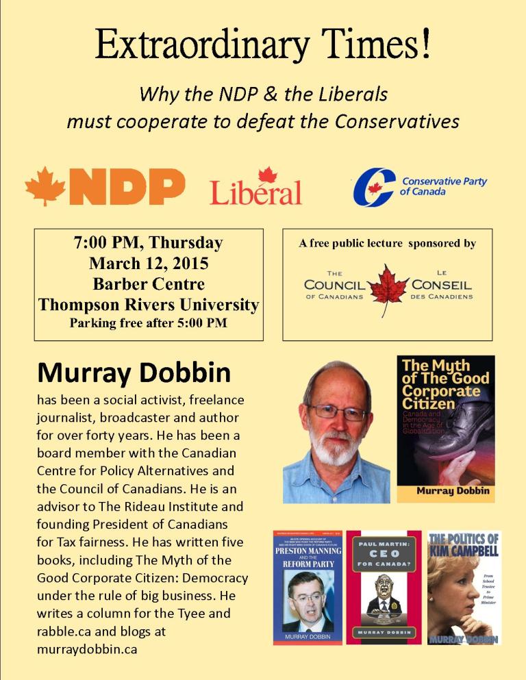 KAMLOOPS - The Kamloops Chapter of the Council of Canadians is hosting a talk by author and social activist Murray Dobbin who, noting these are extraordinary times, is encouraging federal New Democrats and Liberals to cooperate to defeat the Conservatives in the next national election set for Oct. 19. Anita Strong, chair of the local...
