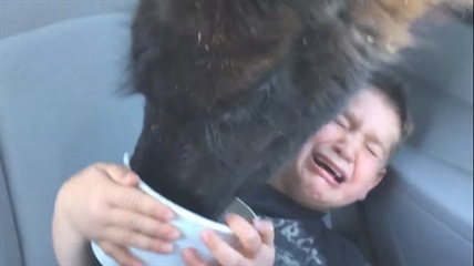 A family appears to be stopped in a drive-thru petting zoo or farm when a…