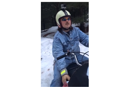 TRENDING NOW: Denim dude is determined to land a snowmobile jump