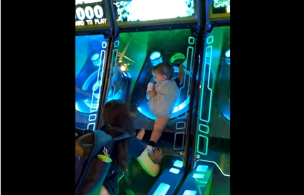 A brief video of a toddler getting himself stuck inside a Skee-Ball machine in Las…
