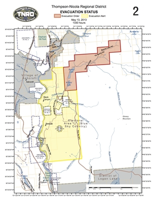 For Immediate Release (May 13/13): The Thompson-Nicola Regional District is officially reducing the area under the Evacuation Order issued Sunday, May 12, in the area south of Ashcroft affected by the Spatsum Creek Wildfire in Electoral Area "I" (Blue Sky Country). The area previously under an evacuation order included all properties northeast of Barnes Lake...