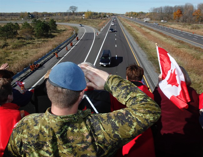 TORONTO – The body of a reservist gunned down at the National War Memorial this week in a shooting that all but paralyzed the nation's capital was expected to arrive in his hometown of Hamilton via the Highway of Heroes on Friday evening, police said.