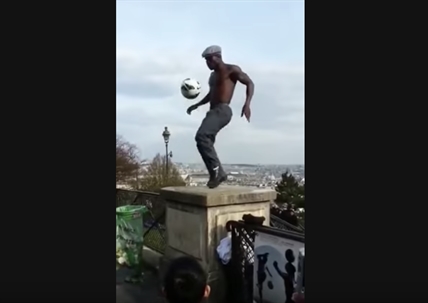 This guy not only juggles a soccer ball with his feet, head and shoulders, he…