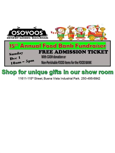 This is our 15th Annual Food Bank Fundraiser, Free admission with CASH or Non-perishable food items for the Food Bank.There are 45 trains running on 2 km of track and 19000 hand painted little people place in funny situations around the display. There is also a unique bus system that runs around.So many different things to discover and explore