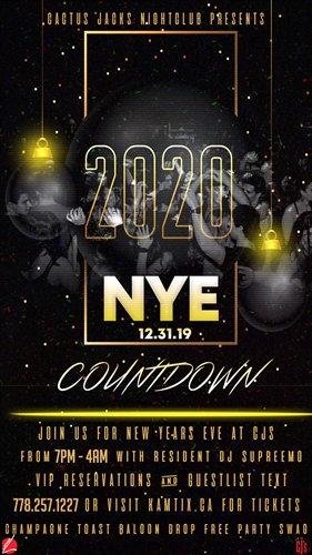 2020 NYE’20 AT CJ’S!JOIN US FOR NEW YEARS EVE AT CJ’S WITH RESIDENT DJ @supreemo_officialIT’S THE END OF A DECADE!VIP RESERVATIONS & GUESTLIST TEXT 778.257.1227 OR VISIT www.kamtix.ca FOR TICKETS! *Champagne Toast, Balloon Drop and free party swag!
