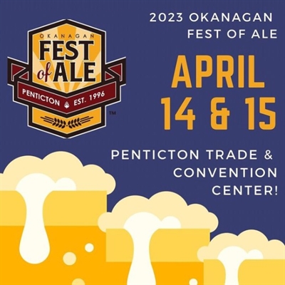 The Board of Directors of the Okanagan Fest of Ale Society are excited to announce that the 2023 Okanagan Fest of Ale will take place on, Friday, April 14th, 4PM – 9PM Saturday, April 15th, 12PM – 6PM at the Penticton Trade and Convention CentreA must attend beer festival in BC! Save the Date to enjoy craft beer and cider at the at the 26th annual Okanagan Fest of Ale on Friday, April 14th, 4PM – 9PM, and Saturday, April 15th, 2023, from 12PM – 6PM at the Penticton Trade and Convention Centre.The Okanagan Fest of Ale has been bringing together craft beer lovers and craft brewers to celebrate the almighty ale since 1996! Every April, Penticton is host to one of the largest and longest running annual beer festivals in the Pacific Northwest. This two-day event features great entertainment, fabulous food and the opportunity to sample a diverse array of quality crafted beverages. Operating as a non-profit society, organizers are committed to support and promote the growing world of quality brewery products, local tourism and local charitable organizations. Since its inception, over $700,000 in net proceeds has been gifted back to qualifying registered charities!Enjoy Okanagan hospitality and great craft beer year round in Penticton. Named Canada’s Craft Beer Capital by Lonely Planet and one of the Best Beer Towns in Canada by Expedia and one of the Top 10 Best Destinations for Beer Enthusiasts, 2018 by askmen.co Penticton’s booming craft beer scene won’t be BC’s best kept secret for much longer.Penticton boasts a lively craft beer scene. It is home to 8 craft breweries which makes Penticton the beer capital of BC with more breweries per capita than any other Canadian city!Long before the craft beer craze the city has acted as host for the Fest of Ale. The annual festival features craft beer and cider from BC and beyond and one of the longest running and largest beer festivals in the Pacific Northwest.Many local establishments offer a great selection of craft brews and fabulous fare. Make plans to check out the year round local craft breweries in the sudsy Okanagan. Fri • April 14, 2023 • 4:00 PM – 9:00 PM Sat • April 15, 2023 • 12:00 PM – 6:00 PM
