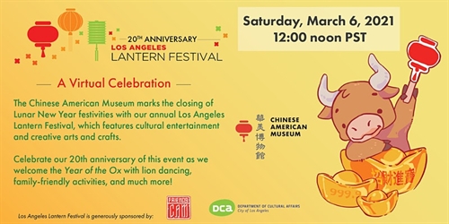 The Chinese American Museum presents the 20th anniversary of the Los Angeles Lantern Festival!About this EventThe Chinese American Museum will be welcoming the Year of the Ox at our milestone Lantern Festival. Join us as we celebrate the new year with lion dancing, family-friendly activities, and much more.We will also be hosting a silent auction on the day of the event.For twenty years, the Los Angeles Lantern Festival has captured the spirit of this 5,000 year-old Chinese tradition of bringing in a new beginning and hope for the upcoming year. The festival showcases a broad spectrum of arts, performances, folk crafts, literature and lanterns. The event has engaged multi-generational families in the sharing of Chinese American culture, building of community relations, and celebrating our city’s diversity.Thank you to our sponsors:Friends of the Chinese American MuseumDepartment of Cultural Affairs, City of Los Angeles