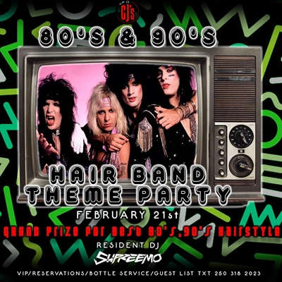 80’s 90’s Hair Band Theme Party!Friday February 21st 10pm-2am.GRAND PRIZE FOR BEST 80’S 90’S HAIRSTYLE!Beats by Resident DJ Supreemo!VIP/Birthday text: 250.318.2023