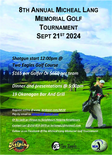 <p>The Micheal Lang Memorial is a charitable event that was started in 2017 to honour our son and give back to the community. Micheal started golfing at the age of 7 and soon grew very passionate about the sport. He grew up in West Kelowna where he golfed on both Shannon Lake golf course and Two Eagles, where he also worked for a couple of years during his teens. <br /> After Micheal’s passing in 2016 we wanted to do something to remember him by and give back to the community he grew up in. Over the last 8 years we have had very successful tournaments and thanks to the support of local businesses, golfers and individuals, as well as many volunteers, we have been able to donate substantial amounts to various organizations throughout West Kelowna and Peachland. <br /> In conjunction with the tournament, we have joined up with The Neighbours Helping Neighbours Society, Two Eagles Golf Course, and Nineteen Okanagan Grill and Bar to host the Tournament. We’d like to thank you in advance for all the support in the past years and look forward to a great tournament this year!</p>