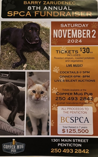 <p>The 8th Annual SPCA Fundraiser at The Copper Mug Pub is back November 2nd!! <br />You don’t want to miss this amazing night to raise money for the Penticton SPCA. <br />Tickets are $30 each and available at the bar (250-493-2842) or by email (bzarudenec@gmail.com) <br />Tickets include dinner – Roasted strip loin, roast potatoes & vegetables. <br />There will be a silent & live auction and a live band. <br />This fun night is to raise money for an amazing cause, you don’t want to miss it!</p>