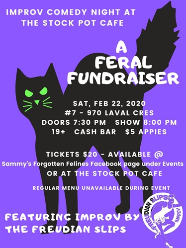 Fundraiser to provide medical care for a colony of feral cats in Kamloops. Improv Comedy provided by The Freudian Slips $5 Appies and Cash Bar.19+