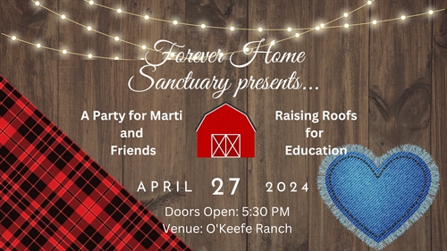 <p>Price: $50 per person, includes Entry, delectable grilled cheese and tater tots from Shabbang food truck, a glass of beer or cider, and an unforgettable experience. <br />Dress code: Plaid and Jeans <br />Live Band: Enjoy the rocking tunes of Rockanagan throughout the evening. <br />50/50 Draw: Try your luck for a chance to win big! <br />Silent Auction: Bid on exclusive items and experiences. <br />Liquor Bar: Sip on your favorite alcoholic and non alcoholic beverages. <br />Dessert Bar: Satisfy your sweet tooth with delectable treats. <br />All proceeds from this event will go towards building an educational pavilion at Forever Home Sanctuary, making a lasting impact on the lives of animals and those who care for them. <br />Limited Tickets Available: <br />Secure your spot at this heartwarming event! Tickets are limited to 100 guests. <br />To reserve your ticket, please e-transfer $50 to fhsanctuary@gmail.com. Be sure to include your name and “Marti and Friends” in the message. <br />Don’t miss out on this chance to celebrate Marti and Friends while contributing to a brighter future for Forever Home Sanctuary. Let’s come together for a night of joy, compassion, and community spirit! <br />For more information, contact us at fhsanctuary@gmail.com or visit our website www.foreverhomesanctuary.net.</p>