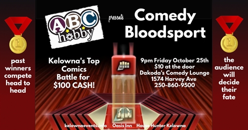 ABC Hobby is excited to present Comedy Bloodsport! Comedy Bloodsport is the comedy show that pits the top comics in the Okanagan AGAINST EACH OTHER And you get to be the judge! There will be 100 dollars in cash for the winner. Many of the comedians on this show have appeared on Just For Laughs Northwest, the Kelowna Comedy Festival, and have toured across Canada. This tournament has ruined life long friendships. It is is a winner take all fight to the death(not really). Please support our generous sponsor, ABC Hobby!