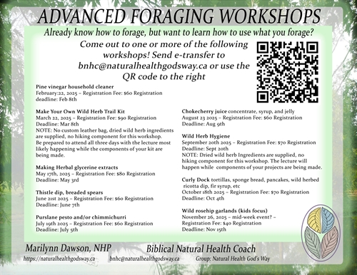 <p>Do you like the handmade look during Christmas holidays? Do your kids enjoy creating craft paper streamers, paper snowflakes, and helping you bake Christmas goodies? Then bring them out to this advanced foraging workshop!We will go out and harvest wild rosehips, then return to learn about them while we make strings of garland from them. Each person will make a garland from the berries they harvested in their bag.Prepare for up to 6 hours spent foraging, creating and learning.Review full details of this year’s advanced foraging workshops, as well as information around dates, registrations, cancellations, etc.Register online before November 15th or send your $40 registration fee by e-transfer to bnhc@naturalhealthgodsway.ca</p>