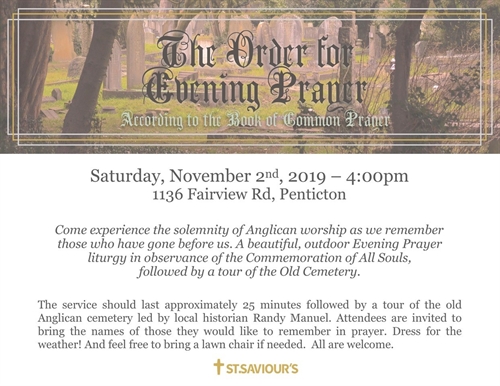 Come experience the solemnity of Anglican worship as we remember those who have gone before us. A beautiful, outdoor Evening Prayer liturgy in observance of the Commemoration of All Souls, followed by a tour of the Old Cemetery.The service should last approximately 25 minutes followed by a tour of the old Anglican cemetery led by local historian Randy Manuel. Attendees are invited to bring the names of those they would like to remember in prayer. Dress for theweather! And feel free to bring a lawn chair if needed. All are welcome.