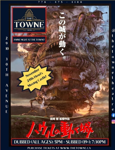 <p>Anime Night at The Towne Thursday, November 24th presents Howl’s Moving Castle. Purchase your ticket online and you’ll be entered to win a Patron Pass which gives you a $2 discount at the box office for a year (excludes private rentals/screenings and specially priced events)We’re also excited to be hosting Fan Fanatic for the evening. Come check out this local anime artist and artisan5:00pm – all ages dubbed versionhttps://www.thetowne.ca/movie/howls-moving-castle-dubbed7:30pm – 19+ with wine bar, subbed versionhttps://www.thetowne.ca/movie/howls-moving-castle—subbed-19–screeningFrom director Hayao Miyazaki, “Howl’s Moving Castle”, is an Academy Award®-nominated acclaimed fantasy based on the novel of the same name. Sophie, an average teenage girl working in a hat shop, finds her life thrown into turmoil when she is literally swept off her feet by a handsome but mysterious wizard named Howl. But after this chance meeting, the young girl is turned into a 90-year old woman by the vain, conniving Witch of the Waste. Embarking on an incredible adventure to lift the curse, she finds refuge in Howl’s magical moving castle.As the true power of Howl’s wizardry is revealed, and his relationship with Sophie deepens, our young grey heroine finds herself fighting to protect them both from a dangerous war of sorcery that threatens their world. Dubbed in English on November 26 and subtitled on November 27, this special two-day event will also feature GKIDS Mini-Fest, an ongoing festival of the best animated shorts from around the world.</p>