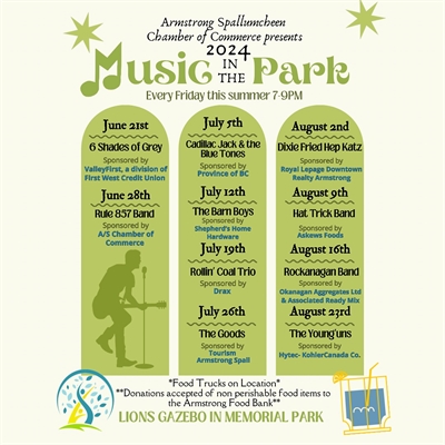 Every Friday evening in Memorial Park from 7pm to 9pm, you can enjoy live music, Food trucks & good company all summer! Bring a lawn chair, friends & family, & your best dance moves! We will be collecting non-perishable food items for the Food Bank every Friday evening as well.