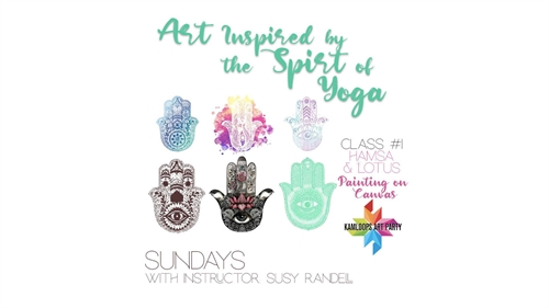 <p>Explore the Visuals of Yoga symbols & Create unique paintings in a positive vibe atmosphere. Susy Randell is a certified art teacher, yoga teacher and reiki healer. She has studied chakras and yoga symbols and will help you paint them using a simple step by step guided lesson. You will be able to add your own personal touches to the paintings and choose your own colours so they are personal and unique.Ticket are $50 which includes all supplies, instruction, a 16″ x 20″ canvas and a complimentary tea.This class is for ages 16+We provide aprons however please wear comfortable clothing that you don’t mind getting paint on just in case.Register online at https://www.kamloopsartparty.com/events/art-for-the-soul-hamsa-and-lotus</p>