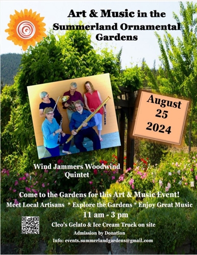 Looking for a wonderful combination of live music, local artists and artisans showcasing their work and a glorious setting among spectacular trees, shrubs, perennials and annuals? You’ll find it all at the Art and Music in the Summerland Ornamental Gardens event on Sunday, August 25. This is a perfect Sunday outing where you can relax and listen to live music from the Windjammers Woodwind Quintet, talk with the artists and peruse their works and take in the unmatched setting of the historic gardens. The event takes place from 11 am to 3 pm. Admission is by donation. Bring a picnic lunch to eat in the shade!