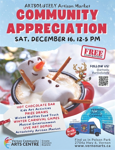 <p>Indulge in the complementary offerings at the hot chocolate bar and explore the indoor artisan market and its 40+ vendors. Be entertained by live music while artists captivate you with enthralling art demonstrations including Raku firing, wheel thrown pottery, chainsaw carving, and live painting. On location we also have the Winter Carnival Games Igloo, Beach Radio, and the sweet and savoury offerings from Wicked Waffles Food Truck (their last stop of the year). <br /> As a token of our gratitude, we’re excited to announce two opportunities to win an Artsolutely Shopping Spree, providing attendees with the chance to bring home a piece of the artistic magic on display. One adult will win $150 and one youth will win $25. Winners can pick their own prize from one of our forty-two artists. For our youngest art enthusiasts, there will also be engaging art activities, ensuring a daily of creative exploration for all. <br /> “This Community Appreciation Day is our way of giving back to the incredible community that has supported the Arts Council and Arts Centre for decades, and this important fundraiser for the past 18 years. We extend our heartfelt thanks to everyone who has championed local artists and made this event a resounding success.” says Rodney Goodchild, Manager of the Vernon Community Arts Centre. <br /> Patricia Doyle, an Artsolutely artisan and long-time VCAC staff member and instructor, has to say about the event: “The Arts Centre is excited to show what the Arts Centre has to offer, not just during Artsolutely, but the rest of the year too! The art demonstrations give insight into the artists’ processes as well as the classes offered at the Arts Centre”</p>