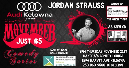 Audi Kelowna proudly presents a Movember Comedy Series! Each Thursday night in November will feature a different headliner for just $5 with 100% of the ticket sales going toward a men’s charity! This week its Jordan Strauss with 100% of ticket sales going toward Kelowna’s Canada Mental Health Association.Alberta’s top comic, Jordan Strauss, is coming to Kelowna! He destroyed the competition to take 1st place at the Calgary Funny Fest and now he is coming to rip the roof off Dakoda’s Comedy Lounge! You have seen him at Just For Laughs Northwest. You’ve watched him WIN Comedy Bloodsport. You’ve seen him headline the Wine & Laughs Comedy Festival. You’ve laughed at his jokes on Comedy Is Fun….Live on Shaw TV. You chortled at his observational quips at the Kelowna Comedy Festival. Now get up close and enjoy Jordan Strauss IN PERSON! LIVE AT DAKODA’S COMEDY LOUNGE!