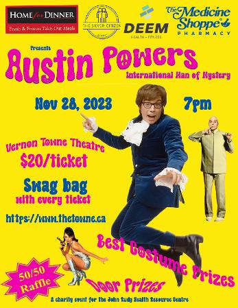 <p>Come join us for November 28th at 7:00 PM where the John Rudy Health Resource Centre will be hosting a FUN FILLED, Austin Powers International Man of Mystery Night to raise money for the Medical Transportation Fund and our Caregiver Support Fund.This is intended to be an all-ages event filled with fun, costumes, prizes and swag bags. We will have our volunteers dressed up, giving out Swag Bags and you might even get lucky by getting a picture with them.Tickets will be 20.00 in advance from Towne Theater or at the door which will get your entrance to the movie, a swag bag and chance of door prizes and costume prizes.There will also be a 50/50 RaffleHope to see you at this Fun-Filled Event to help support our amazing community of Vernon…Yeah Baby!The John Rudy Health Resource Centre Association was established in Vernon in 2016. Our mission is to improve the health and well-being of the community by addressing health literacy needs and empowering people to take an active role in their health and that of their families. Our health resource centre is free to everyone and we strive to help people find, access, understand and use health information and services. For more information check out johnrudyhealth.ca</p>
