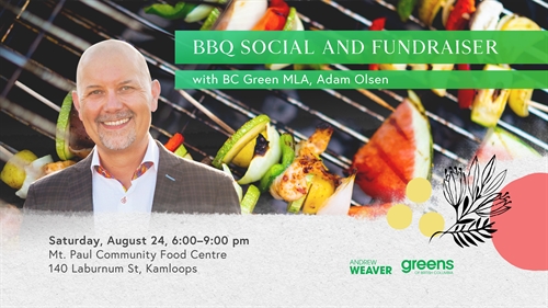 Join MLA Adam Olsen for a barbecue fundraiser, hosted by the Kamloops Riding Association.Adam will speak about the BC Green Caucus’ accomplishments in the legislature. This is a great opportunity to pledge your support for our continued work.Please RSVP by Aug. 21 so we know how much food to prepare. The event is by donation, with a suggested monthly gift of $5/person, which includes a burger and beverage.Only $20 for a one-time contribution.