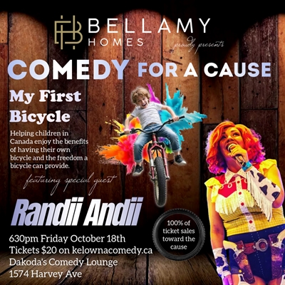 <p>Get ready for a night of non-stop laughter and heartfelt generosity as Bellamy Homes proudly presents Comedy for a Cause in support of the My First Bicycle Foundation, featuring the sensational Randii Andii! Known for her bold humor, outrageous costumes, and hilariously provocative parody songs, Randii Andii is no ordinary comedian. She’ll take you on a wild musical comedy adventure where your favorite tunes will never sound the same again.From original comedy to show-stopping musical numbers, Randii’s high-energy performances and larger-than-life stage presence guarantee a one-of-a-kind experience. Whether she’s entertaining crowds of 10,000 or touring with Carnival Cruise Lines, Randii Andii always leaves audiences laughing and wanting more.Join us on Friday, October 18th, at 6:30 PM at Dakoda’s Comedy Lounge for an unforgettable evening, also featuring Kelowna Comedy’s top comics, as we come together to spread joy and provide brand-new bicycles for kids in need. Every laugh counts, as 100% of ticket sales go directly toward the My First Bicycle Foundation.Don’t miss your chance to make a difference—grab your tickets now at kelownacomedy.ca!</p>