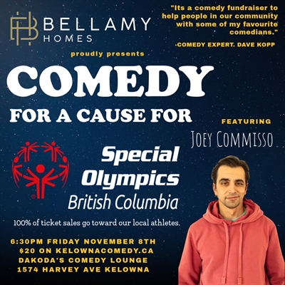 <p>Bellamy Homes proudly presents Comedy for a Cause in support of Special Olympics BC, featuring the incredible Joey Commisso! Prepare for a night of laughter as Kelowna’s top comedians take the stage, headlined by Joey, whose comedic style transcends boundaries and connects with audiences from all walks of life.Hailed internationally for his sharp wit and flawless delivery, Joey has performed across Canada, the USA, and Europe, gracing prestigious events like JFL Vancouver and Standup NBC. A nominee for a Vancouver Comedy Award, Joey promises an unforgettable performance that will leave the audience in stitches.Thanks to the unwavering support of Bellamy Homes, 100% of ticket sales will be donated to Special Olympics BC, a remarkable organization that empowers individuals with intellectual disabilities through the transformative power of sport.Don’t miss this extraordinary night of comedy, made possible by Bellamy Homes’ dedication to live entertainment in Kelowna. Get your tickets now for a fantastic cause and a night of side-splitting laughter!</p>