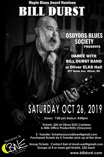 Osoyoos Blues Society presents Bill Durst Saturday Oct 26 Doors: 7:00 pm Dance: 8:00 at Oliver ELKS Hall477 Bank Ave, Oliver, BCTickets $25 at Oliver ELKS Canteen & Mills Office Productivity (Osoyoos)or ticketsosoyoosblues@gmail.com Groups of 4 or more get tickets, $20 ea, From krush.earl@gmail.com
