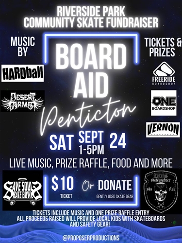 <p>Come out on Saturday September 24 to Board Aid, a fundraiser to support skateboarding in our community. Grab your board, grab your friends and jam out to some live punk and hardcore music at Riverside Park in Penticton. Desert Arms and Hardball are playing an all ages, afternoon show. Lots of great raffle prizes from our local sponsors Freeride Boardshop and One Boardshop. Tickets are $10 and include one raffle entry, or get a free ticket with donation of gently used skate gear. All proceeds raised will purchase low income local skaters with new boards and safety gear. Food truck, skate merch, give aways and more!<br />Tickets available at Freeride Boardshop and One Boardshop Penticton.<br />Contact us with nominations for skaters in need.</p>