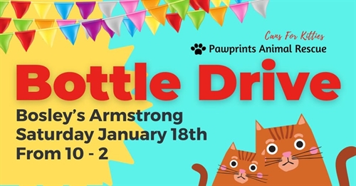 Bottle Drive Saturday, January 18th from 10 -2 hosted by Bosley’s Armstrong. Drop off your Bottles, Cans, and Deposit Paid Refundables to help support the kitties in Pawprints care.