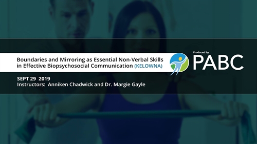 In partnership with UBC CPD, PABC presents: Boundaries and Mirroring as Essential Non-Verbal Skills in Effective Biopsychosocial Communication (Kelowna)Course Description:Therapeutic Alliance as a treatment tool; experiential and reflective exercises in generating a mindful therapeutic relationship as a foundation for a biopsychosocial approach.This is a practical, experiential course exploring participants own sense of presence, grounding, boundaries and mirroring in relationship. Participants unconscious and habitual styles of interaction will be uncovered. This provides opportunity for intentional adaptation to meet both the therapists and clients needs. In this way we address one of the core principles of physiotherapy, patient centred care, whilst integrating self care skills for the professional.The material and techniques are drawn from research, theory and experience in both the health care and somatic psychotherapy realms, and applied with a focus on persistent pain clients.Who are we and how do we present ourselves in our professional roles? What challenges us and where do we go to feel safe as the ‘expert’? What communication styles are we partial to or struggle with? How do we deal with challenging patients? Or the patient that is stuck, non-compliant or far too dependant on us? How do we cope with the personal struggles of being in a caring profession?We will explore these aspects within ourselves and as a group to begin a journey of mindfulness and self responsibility in our professional relationships. This is an essential first step to coaching our patients in their own struggles with their relationship to you, themselves and their pain. A vital foundation for the trusting relationship needed for effective pain education and behavior change.