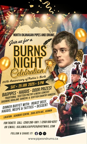 Join us for a night filled with music, dance, food, and all things Robbie Burns, at the North Okanagan Pipes and Drums Burns Night Celebration! Hosted by the North Okanagan Pipes and Drums, this event will also feature captivating performances by the Aviemore Highland Dancers and the Scottish Country Dancers.