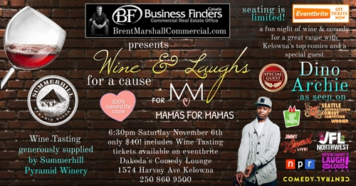 Kelowna Comedy is excited to partner with Business Finders to present a special night of comedy for a great cause at Dakoda’s Comedy Lounge at 6:30pm on Saturday, November 6th. Brent Marshall of Business Finders and David Kopp of Kelowna Comedy are two very different entrepreneurs and yet they share a similar vision for elevating the arts and giving back to the community. “Wine tasting and charity events have always gone well together. It only makes sense to add some entertainment and I am fortunate to work with some of the top talent in Canada. Teaming up with Brent has created an exciting way to put it all together,” says David. Tasting some of Canada’s best wine, supplied by Kelowna’s own Summerhill Pyramid Winery, guests will be entertained by six of Kelowna Comedy’s top comics. The special cap on the evening will be a closing performance from Dino Archie. Dino is a touring headlining comedian from Fresno, California and has appeared on Jimmy Kimmel Live, Just for Laughs, and NPR. Business Finders generous sponsorship of this event means 100% of tickets sales will go to Mamas for Mamas. This is a great way to support the arts while helping out local moms and caregivers in need.Tickets are limited. Go to eventbrite.com to get yours today.
