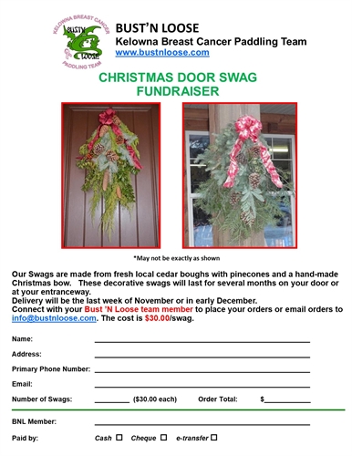 Bust’n Loose’s Annual Christmas Door Swag Fundraiser is BACK. Help support Bust’n Loose, Kelowna’s only Breast Cancer Dragon Boat Paddling Team, by placing your order for your Christmas Swag to “info@bustnloose.com”. Cost per swag is $30.00. Delivery by late November or first week of December. See attached order form.