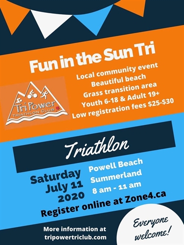 Cancelled due to COVID-19. Join TriPower Triathlon Club for the sixth “Fun In The Sun” Triathlon in beautiful Trout Creek Summerland. This grassroots community event is ideal for youth and adult triathletes who are looking to race in a friendly, low key environment. Shallow water swim, sandy beach, grass transition area and flat bike course combined with very economical pricing makes for a great opportunity to participate with friends!