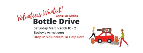 WANTED Volunteers to drop in for any length of time to help sort bottles during our Cans For Kitties Bottle Drives.Drop by anytime during our ongoing bottle drive on Saturday, March 20th from 10 am to 2 pm. Even if it’s only for 15 minutes it all helps!We appreciate your support! “together, we will make a difference” and you do!