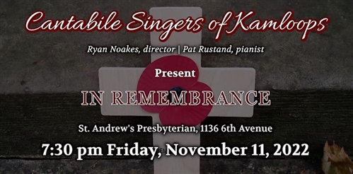 <p>Since 2011, we have brought together the community of Kamloops to remember and honour those affected both directly and indirectly by war and conflict.<br />The choir will be performing moving choral selections ranging from music written in the the 16th Century to gospel spirituals up to the world premiere of a setting of the iconic wartime poem In Flanders Fields composed by Kamloops composer and our music director Ryan Noakes in 2019. The first half of the concert will be dedicated to musical expressions of grief for those who are no longer with us, shifting to a sense of hope for the future in the second half.<br />Remembrance Day is a very important day for so many people. Whether you were affected through service or living in an area impacted by conflict, or you know someone has been or currently is in active service or living through conflict, Remembrance Day can be a very emotional day for many of us. It is a unique privilege for us to be a part of people’s observance of this meaningful day.<br />Tickets<br />https://www.eventbrite.ca/e/in-remembrance-tickets-437771776167</p>