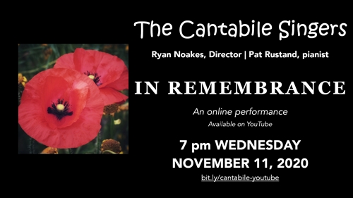The Cantabile Singers of Kamloops are presenting their 10th annual Remembrance Day performance, bringing together the community to remember and honour those affected directly and indirectly by war. This year the performance is presented with a shift to being an online experience on Youtube – due to COVID-19. The singers will all be recording themselves in isolation, with the individual videos being compiled together into a virtual choir performance. The resulting video will be available on the choir’s YouTube channel (http://bit.ly/cantabile-youtube) starting at 7:00 pm on Wednesday, November 11.Because a virtual choir project is a highly labour-intensive undertaking, this year’s Remembrance Day performance will be much shorter than normal with a program of only four songs, including the world premiere of local composer Ryan Noakes’ choral setting of the famous WWI poem In Flanders Fields. The Singers will be performing a moving selection of choral music, progressing from expressing a feeling of grief and loss to a sense of hope for the future – fitting for both Remembrance Day and our current situation.