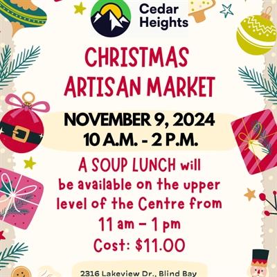 <p>Visit the Cedar Heights Community Centre for a festive Christmas Artisan Market! Featuring local vendors, and a delicious soup lunch.</p>