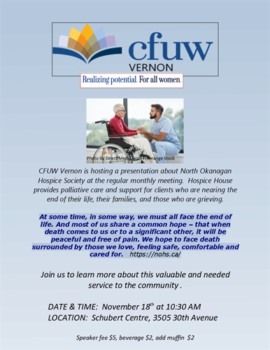 The monthly meeting of CFUW Vernon will be held November 18th at 10:30 am at Schubert Centre, 3505 30th Avenue. The speaker presentation will be about North Okanagan Hospice Society and Hospice House, which provide palliative care, and support for clients who are nearing the end of their life, for their families, and for those who are grieving. Join us to learn more about this valuable and needed service to the community.