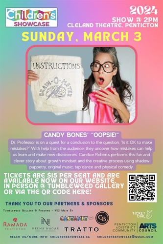 <p>Join the Children’s Showcase on Sunday, March 3 for Candy Bones’ “Oopsie!”at the Cleland Community Theatre in Penticton. <br />Our character, Dr. Professor, is on a quest for a conclusion to the question, “Is it OK to make mistakes?” With help from the audience, together they uncover how mistakes can help us learn and make new discoveries. Award-winning inter-arts maestro Candice Roberts performs this fun and clever story about growth mindset and the creative process through a seamless weaving of shadow puppetry, original music, tap dance and physical comedy in this fun and interactive theatrical workshop experience.</p>