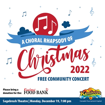 <p>This is a free community concert sponsored by the City—food and cash donations for the Kamloops Food Bank will be gratefully accepted at the door to support residents in our community.<br />Tickets are limited and are available through Kamloops Box Office Live by phone at 250-374-5483, in person at 1025 Lorne Street, or online at KamloopsLive.ca.<br />“Usually, we can turn to our choir rehearsals for an escape from the stresses of the world, to recharge and reinvigorate ourselves, but with the COVID-19 pandemic, that weekly self-care opportunity was taken from us. It has been such a boon to all of us to be able to get back to singing together again, and the return of the Choral Rhapsody performance marks a wonderful milestone in getting some normalcy back into our lives,” said Ryan Noakes, Cantabile Singers of Kamloops’ Music Director. “Choral Rhapsody has always been a fantastic event for everyone in Kamloops singing in a choir. It’s a perfect opportunity for us to share the music we’ve been working on with each other, as well as the community at large.”<br />Seven local choirs and one out-of-town choir will be presenting a delightful selection of Christmas carols with singalongs between sets for audience participation. The choirs in attendance will be:<br />Ashcroft Sage Sound Singers<br />Cantabile Singers<br />Desert Sounds A Cappella +<br />Jeweltones<br />Kamloops Choristers<br />Kamloops Men’s Chorus<br />Kamloops Pride Choir<br />Valley Harmony<br />In addition to the choirs, handbell choir Bells of Note will welcome the audience with a selection of music in the lobby prior to start of the concert.<br />For more information about the event, please call 250-828-3611. To reserve tickets, call 250-374-5483.<br />Tickets:<br />https://tickets.kamloopslive.com/TheatreManager/1/tmEvent/tmEvent2790.html</p>