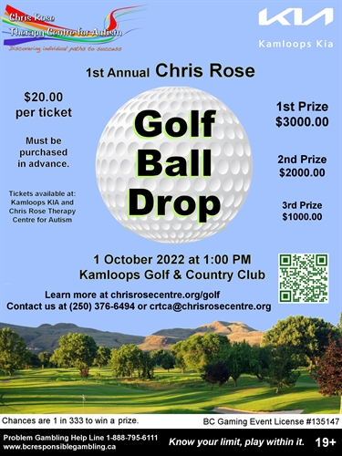 <p>For the first time ever, Chris Rose Therapy Centre for Autism Society is holding a golf ball drop.On October 1 at 1:00 PM, we will be dropping up to 999 balls onto the green at the Kamloops Golf and Country Club, with three cash prizes available to those closest to the hole — $3000 for 1st prize, $2000 for 2nd prize, and $1000 for 3rd prize. (Total number of balls dropped will depend on total number of tickets sold — there are 999 tickets available at $20 per ticket.)Tickets will be available for in person sales at Kamloops Kia and at the Chris Rose Therapy Centre for Autism, or you can call the Centre directly to purchase over the phone and the tickets will be mailed to you. * Tickets will be available at Kia after August 22.Tickets may be sold and purchased in British Columbia only. Ticket sales close September 30, 2022.The proceeds from our fundraising events go directly to helping the individuals we work with receive the intensive therapeutic and educational programming they need.</p>